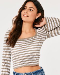 heklani džemper dugih rukava s četvrtastim ovratnikom svijetlosmeđa pruga žene Hollister vrhovi ZV8T64