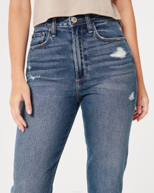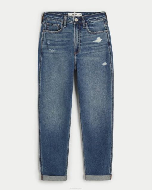 opušteno kroz bedro i sužene od koljena do gležnja, ove mom traperice imaju naš udobni vintage rastezljivi traper u tamnoj boji s poderanim detaljima, izblijedjelim i brkovima. ultra visokog struka.