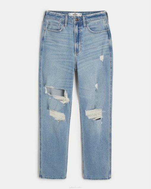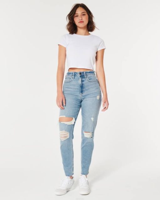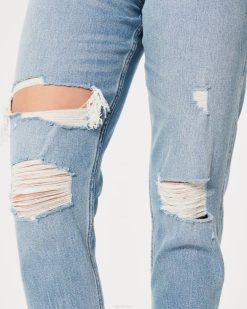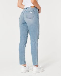 opušteno kroz bedro i sužene od koljena do gležnja, ove mom traperice imaju naš udobni vintage rastezljivi traper u srednjoj boji s poderanim detaljima, izblijedjelim i brkovima. ultra visokog struka.